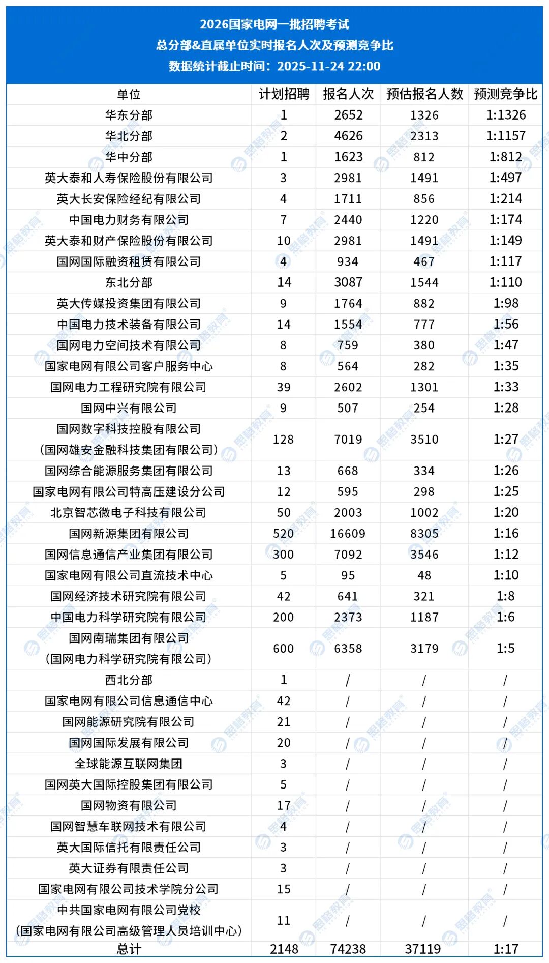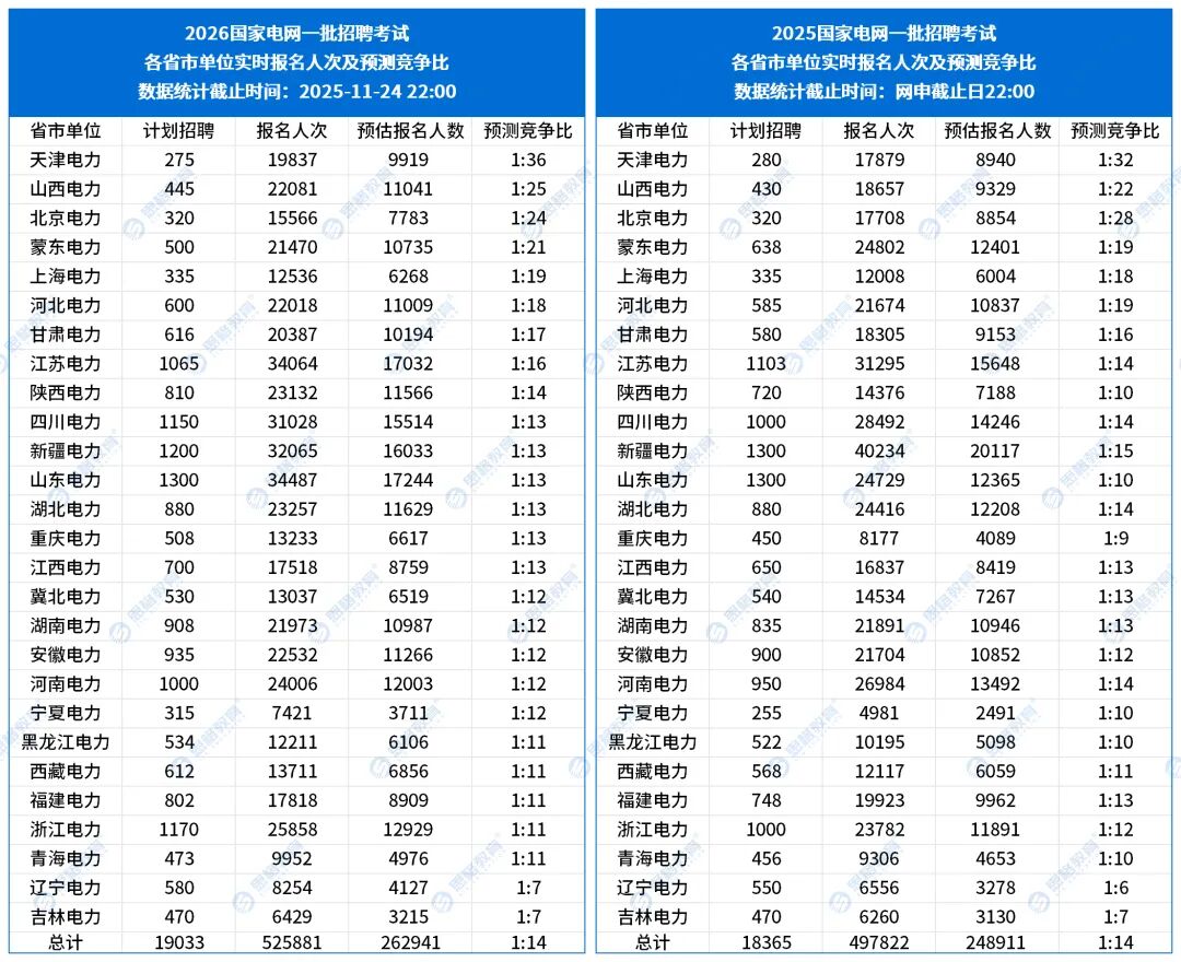 今天是2026國(guó)家電網(wǎng)一批招聘網(wǎng)申的最后一天,小思整理了截至今日22:00各單位的報(bào)名情況,分享給大家~